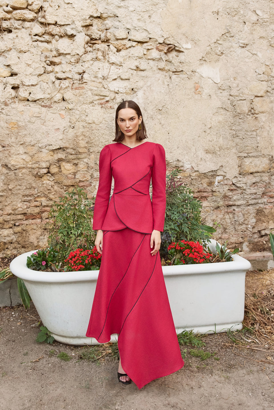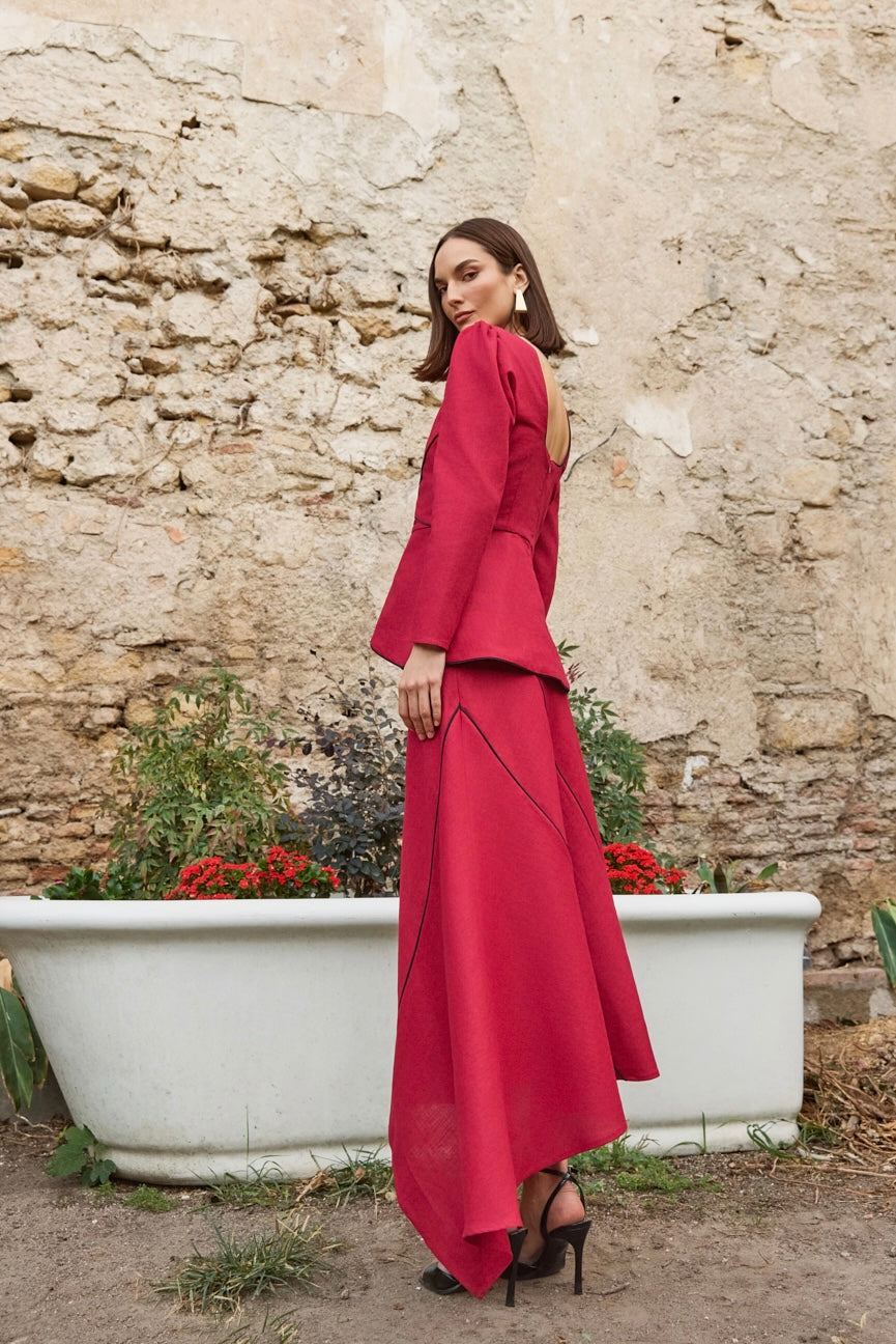 Falda midi asimétrica confeccionada en mezcla de lino y algodón. Cortes diagonales rematados con piping de algodón en color negro.