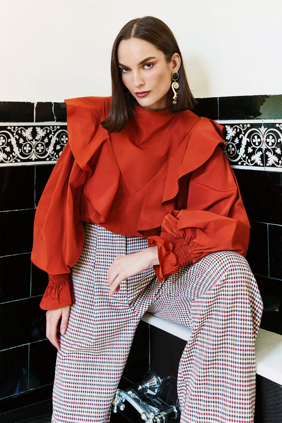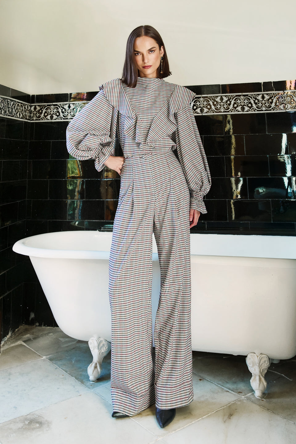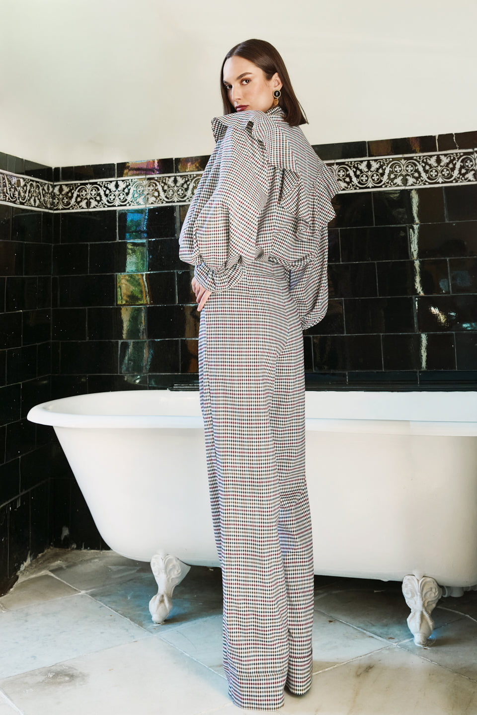 Pantalón tailoring de talle alto y pata ancha, confeccionado en tejido tartán semi-elástico. Detalle de pliegue en delantero y bajo con vuelta. Cierre frontal con cremallera y botón forrado. Aconsejamos evitar el uso de accesorios con pedrería, lentejuela o