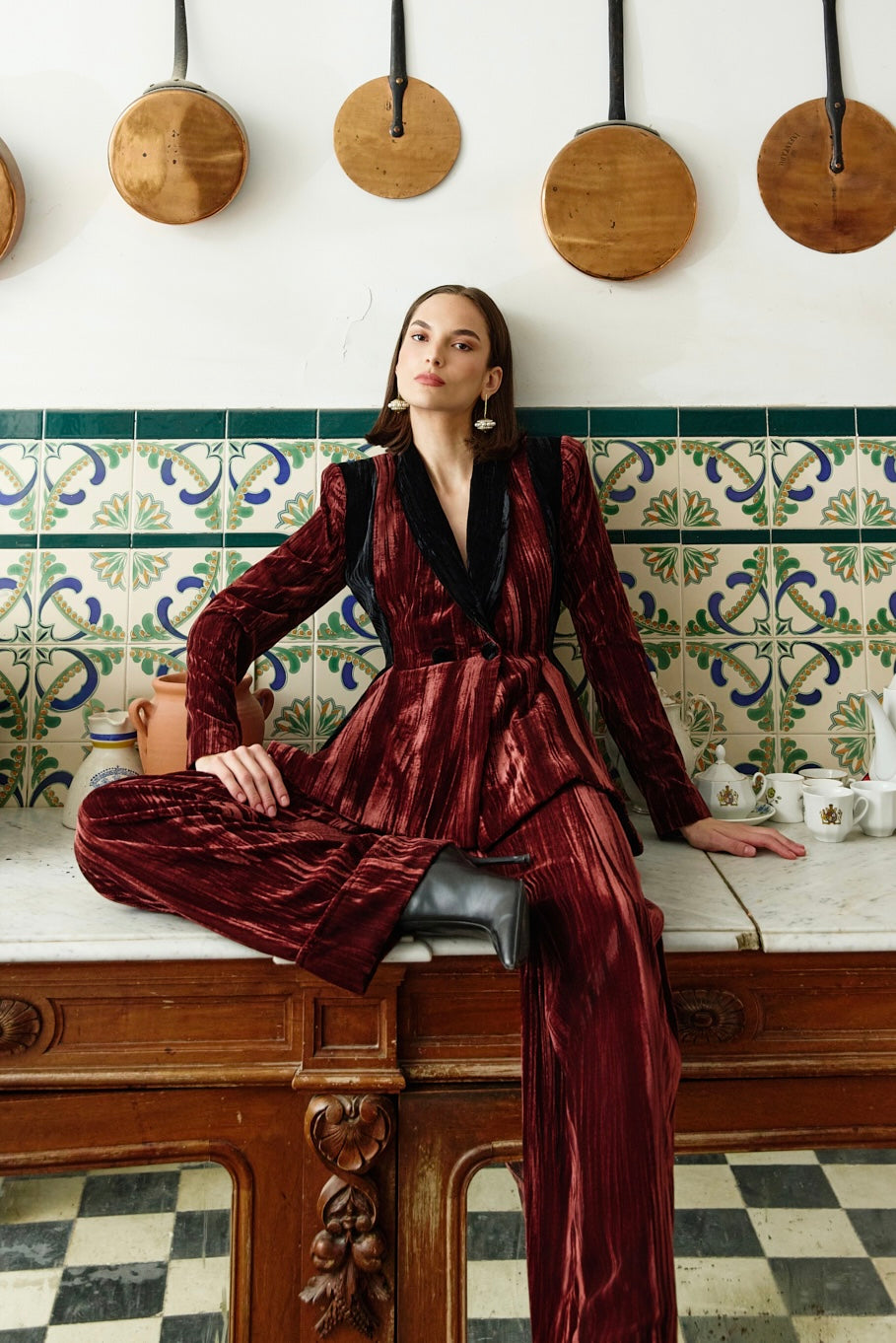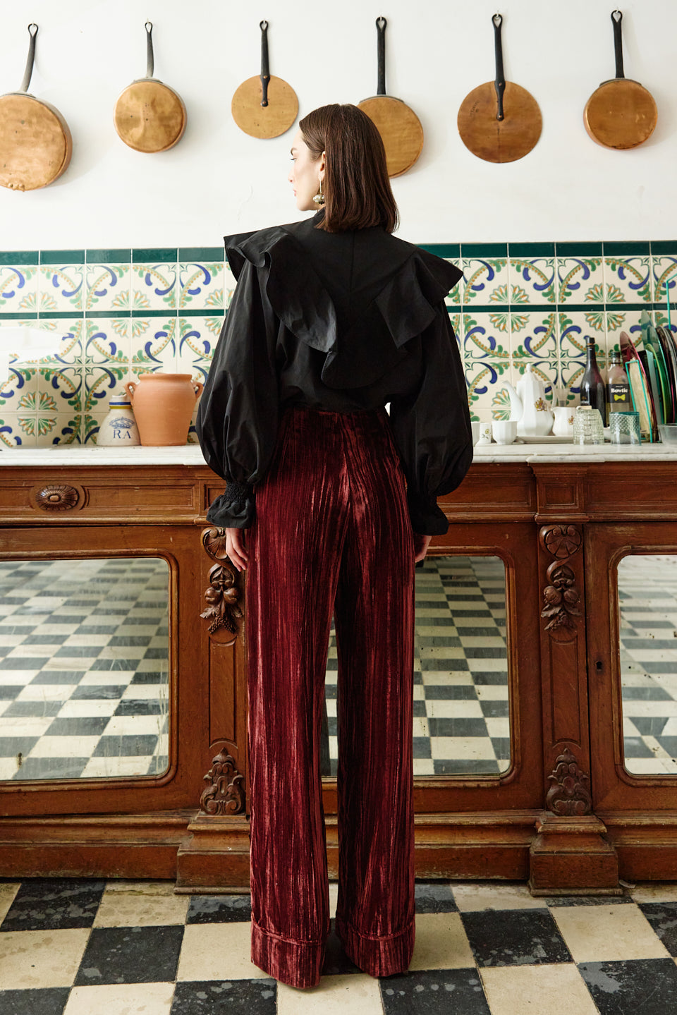 Pantalón tailoring de talle alto y pata ancha, confeccionado en terciopelo rayado. Detalle de pliegue en delantero y bajo con vuelta. Cierre frontal con cremallera y botón forrado. *En caso de duda de talla escoger la superior. Talla pequeño. Aconsejamos evitar el uso de accesorios con pedrería, lentejuela o elementos similares que puedan engancharse y dañar el tejido. *La modelo mide 1,78m y viste la talla XS. COMPOSICIÓN TELAS: 100% POLIESTER. CUIDADO DEL TEJIDO: Lavado en tintorería. Fabricado en España. DEW & CORCH S.L B72580905 C/ Secoya 24, 1ºB, 28044, MADRID. info@dewandcorch.com