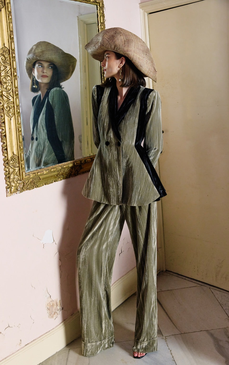 Pantalón tailoring de talle alto y pata ancha, confeccionado en terciopelo rayado. Detalle de pliegue en delantero y bajo con vuelta. Cierre frontal con cremallera y botón forrado. *En caso de duda de talla escoger la superior. Talla pequeño. Aconsejamos evitar el uso de accesorios con pedrería, lentejuela o elementos similares que puedan engancharse y dañar el tejido. *La modelo mide 1,78m y viste la talla XS. COMPOSICIÓN TELAS: 100% POLIESTER. CUIDADO DEL TEJIDO: Lavado en tintorería. Fabricado en España. DEW & CORCH S.L B72580905 C/ Secoya 24, 1ºB, 28044, MADRID. info@dewandcorch.com