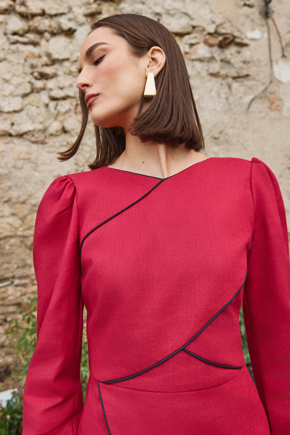 Frontal ornamentado con piping en color negro y peplum envolvente en cintura y cadera rematado con piping.