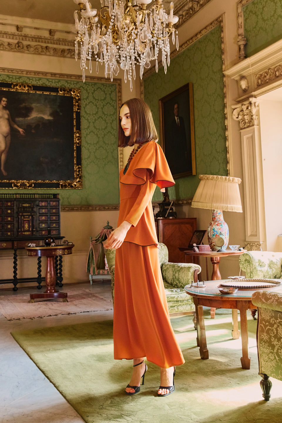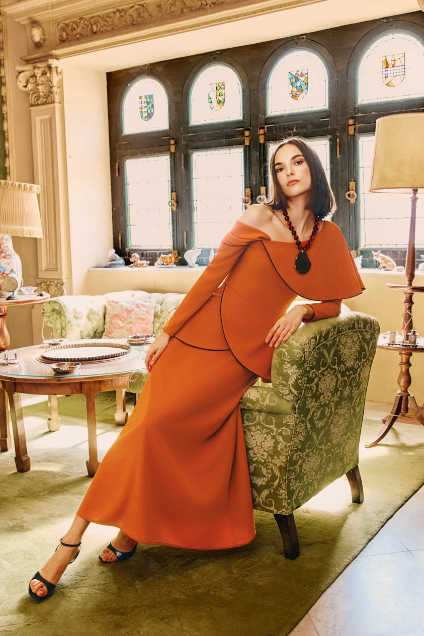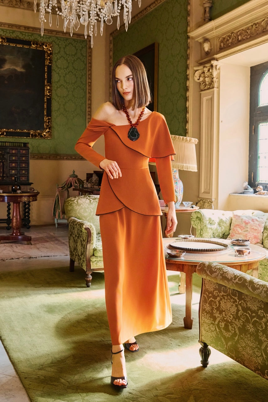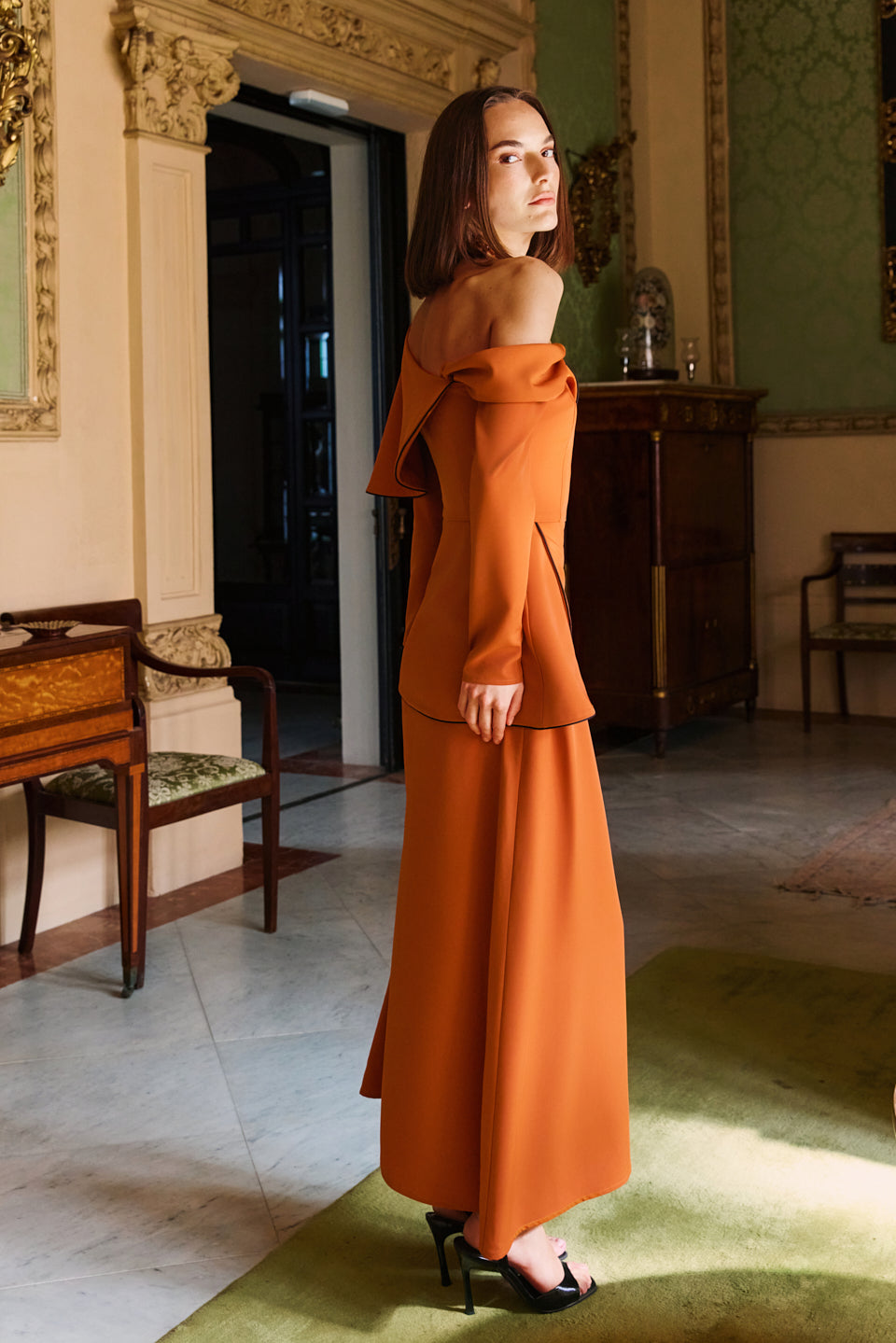 Vestido midi confeccionado en crêpe semi-elástico. Escote de corte asimétrico y volante rematado con piping en negro. Manga larga. Falda larga con peplum creando un volante que envuelve la cintura y cadera rematado en el borde con piping de color negro.