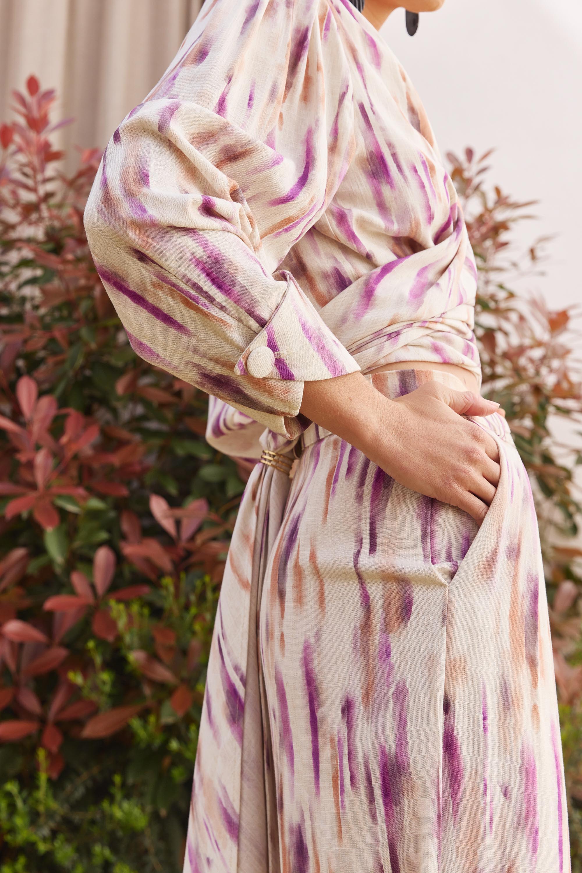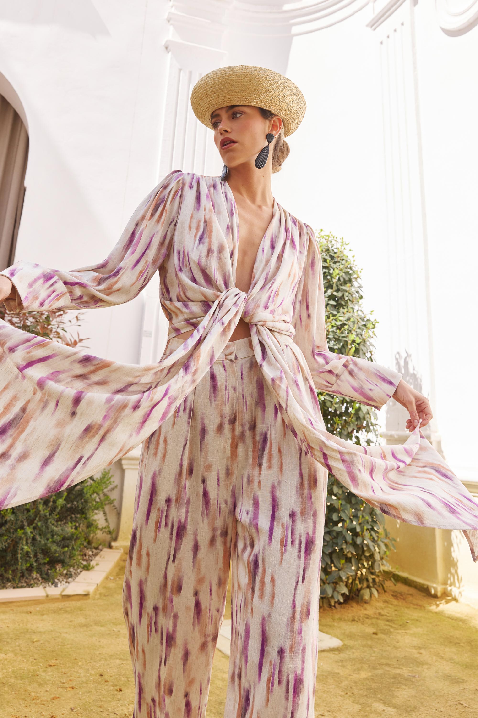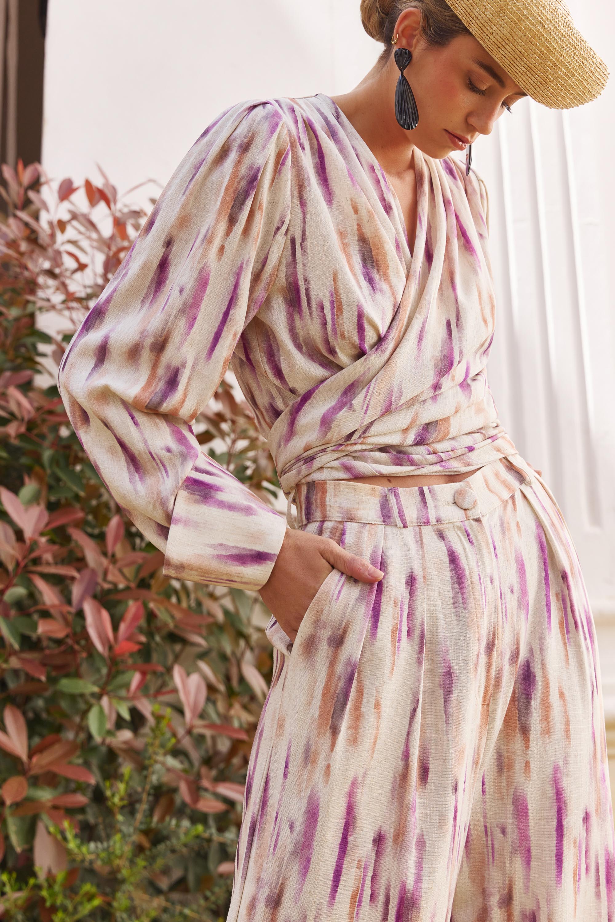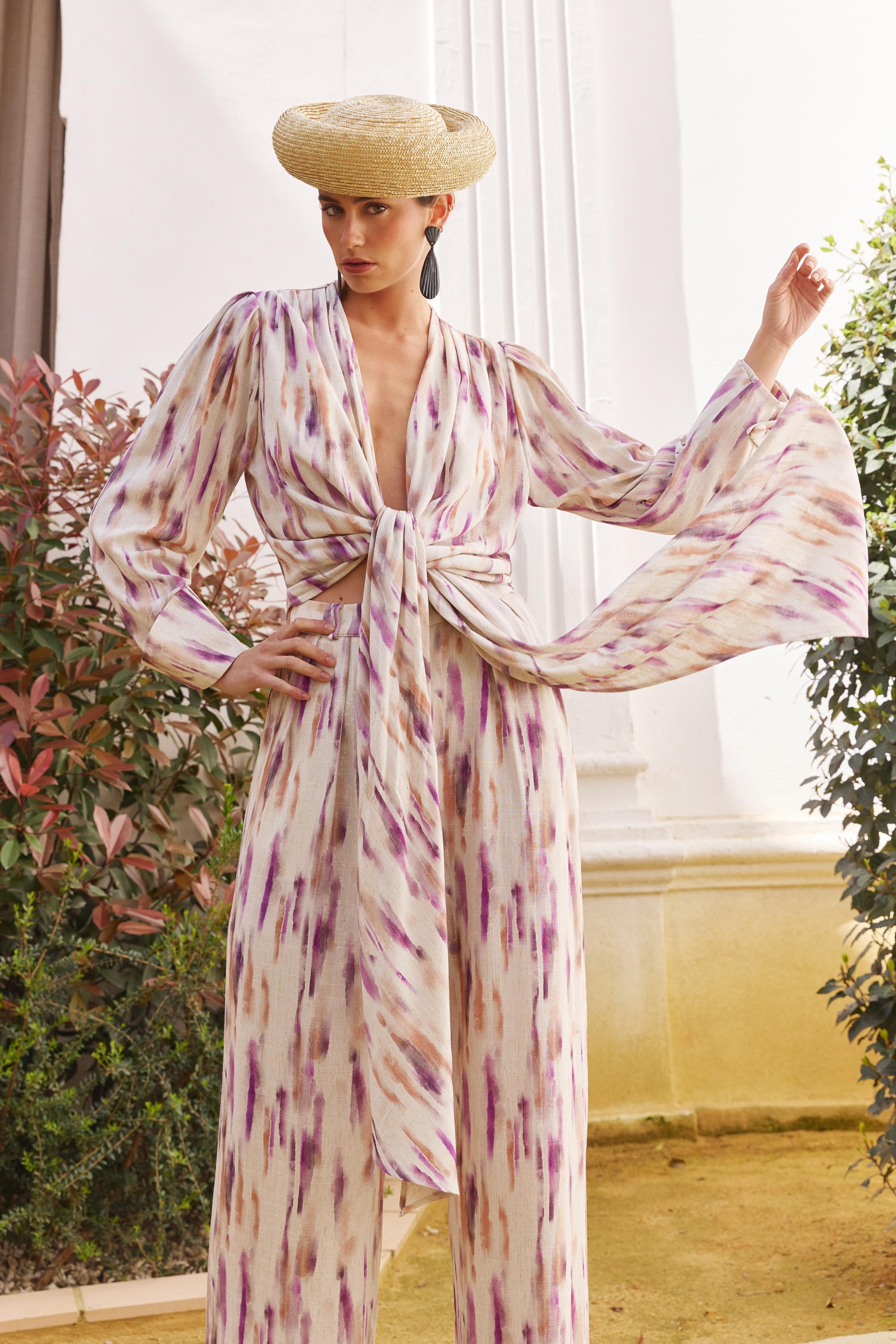 Blusa con escote pronunciado en “V” confeccionada en un estampado de viscosa y lino.