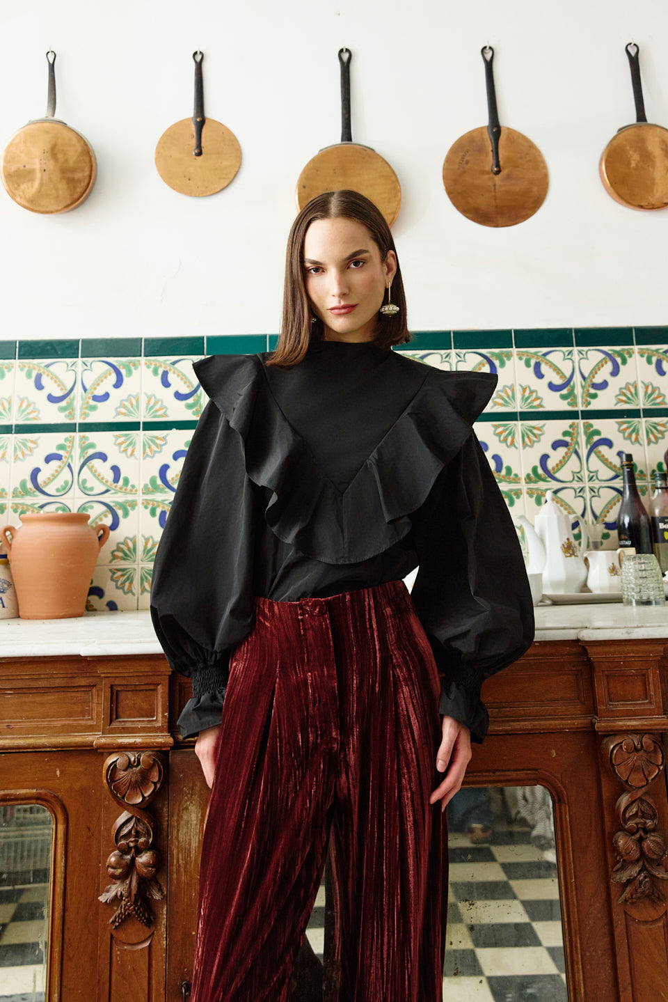 Blusa ancha con cuello chimenea confeccionada en tafetán. Detalle de volante en pico en delantero y espalda.