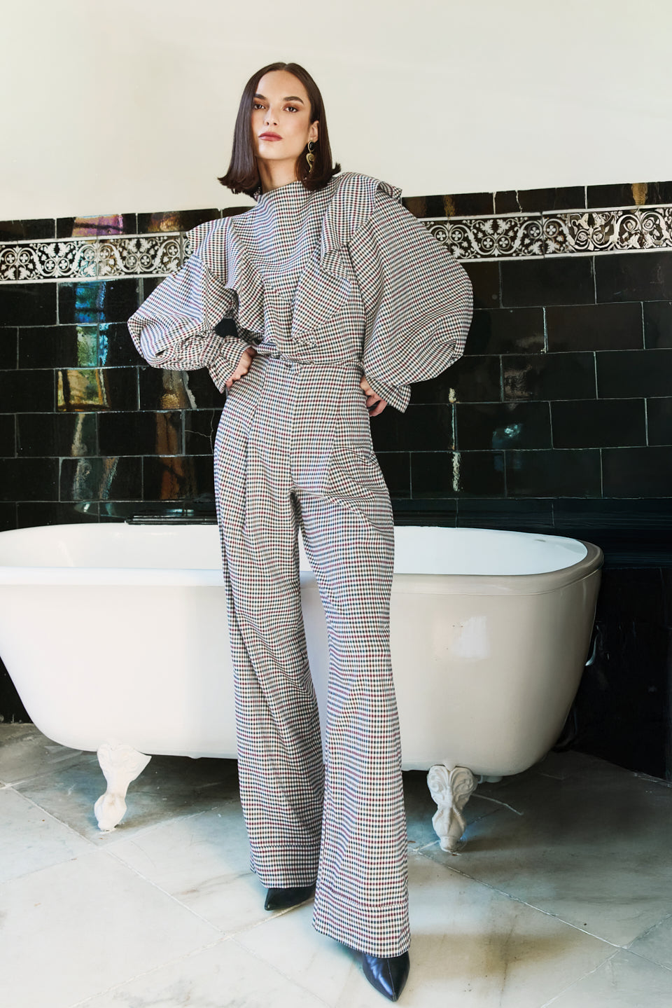 Blusa ancha con cuello chimenea confeccionada en tejido tartán. Detalle de volante en pico en delantero y espalda.