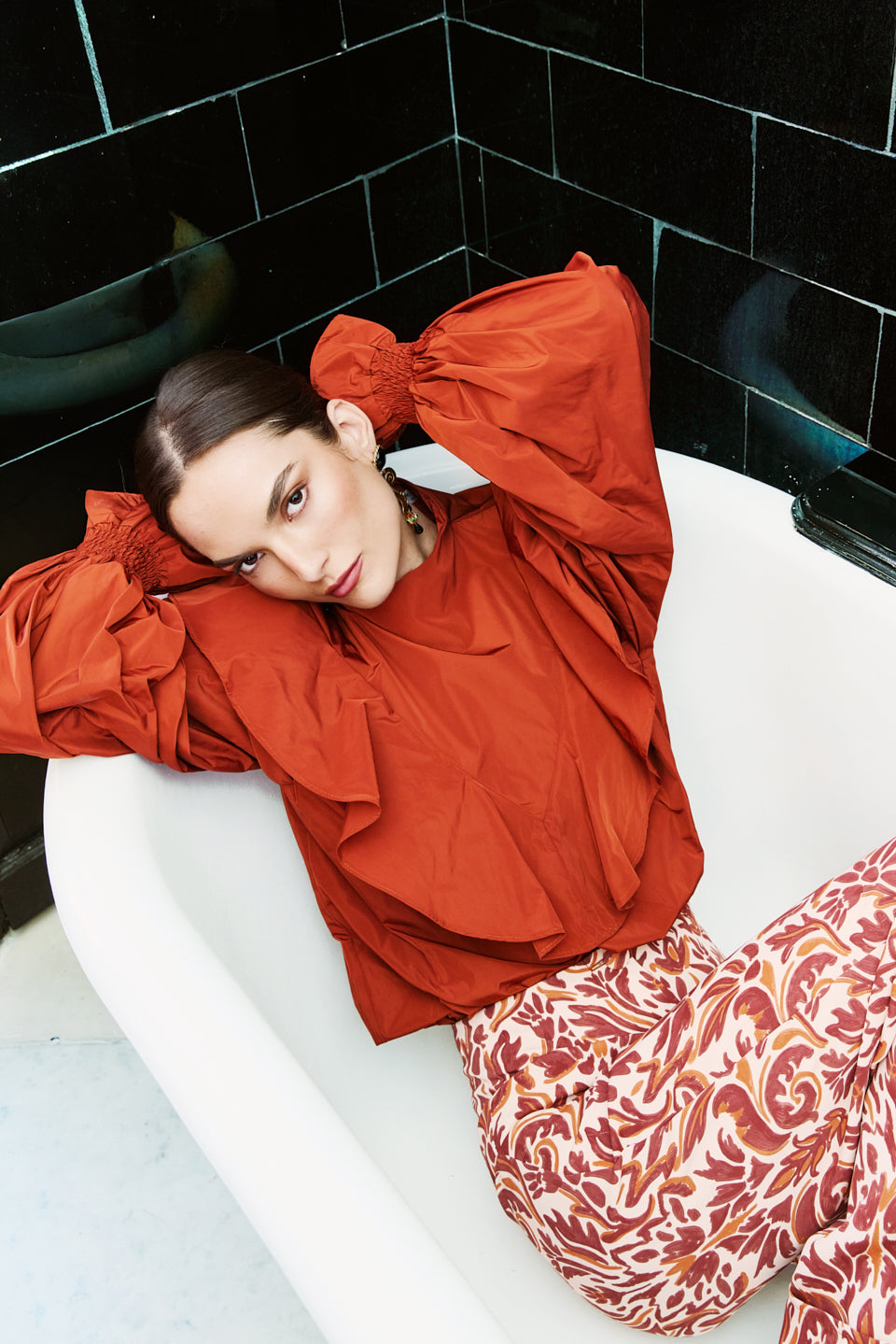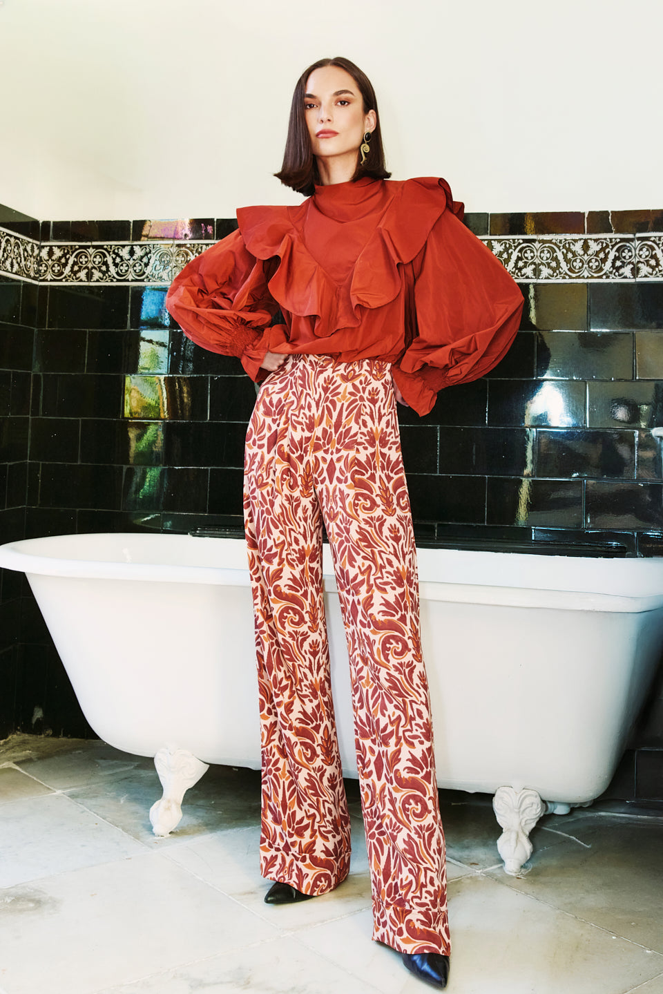 Blusa ancha con cuello chimenea confeccionada en tafetán. Detalle de volante en pico en delantero y espalda.