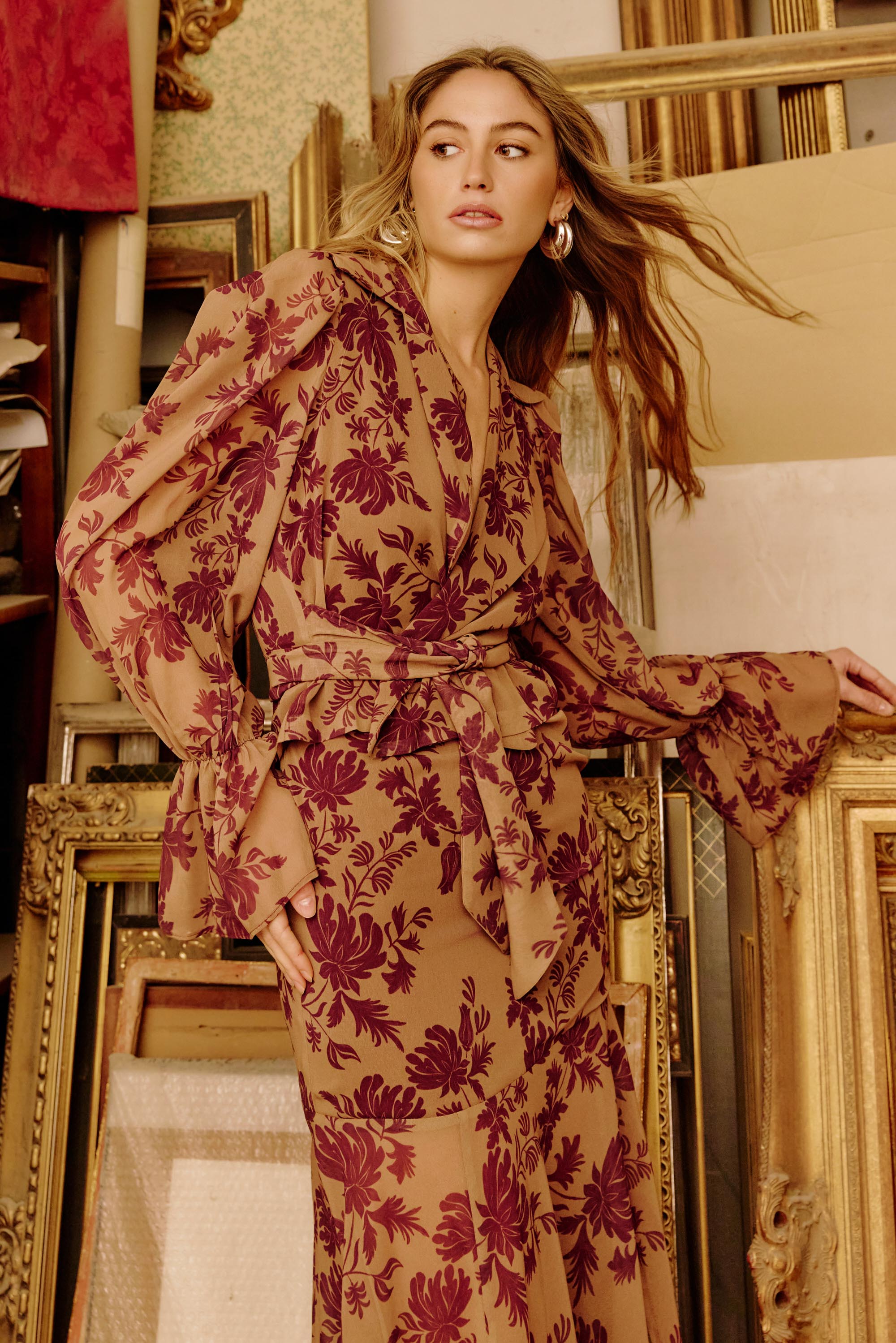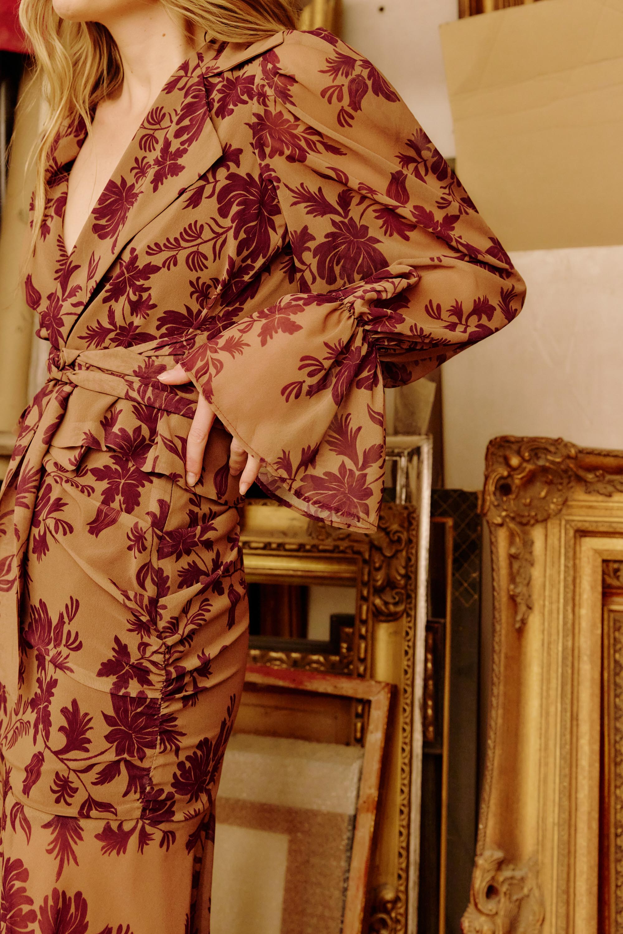 Blusa fluida semitransparente con solapa cruzada y escote en “V”. Confeccionada en gasa georgette con estampado de flores. Mangas largas abullonadas, con volumen desde el hombro hasta la muñeca. Puño ajustado con elástico creando así un efecto volante al final de la manga. Forro en la zona del cuerpo a tono. Cintura marcada con una lazada maxi estilizando la silueta.