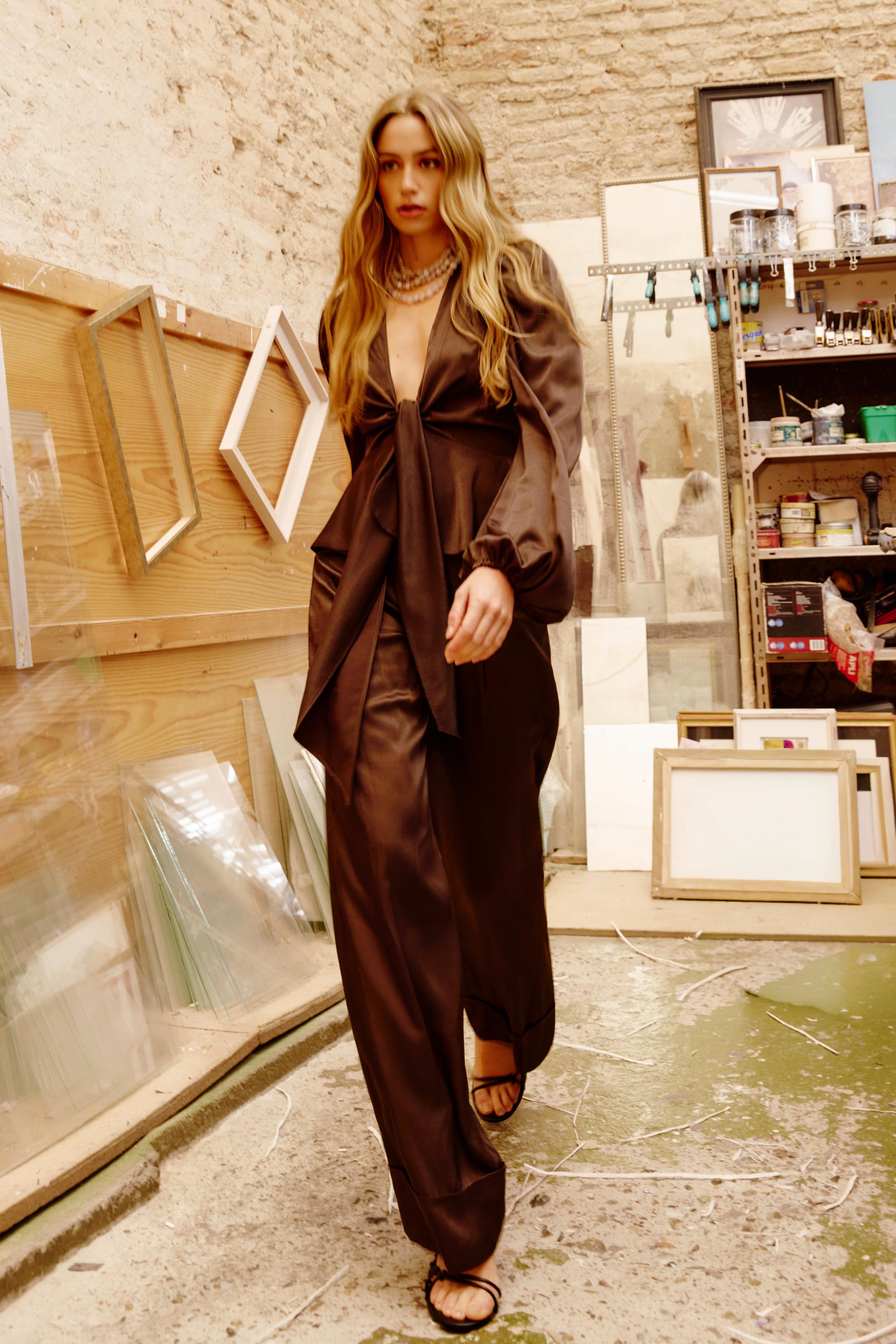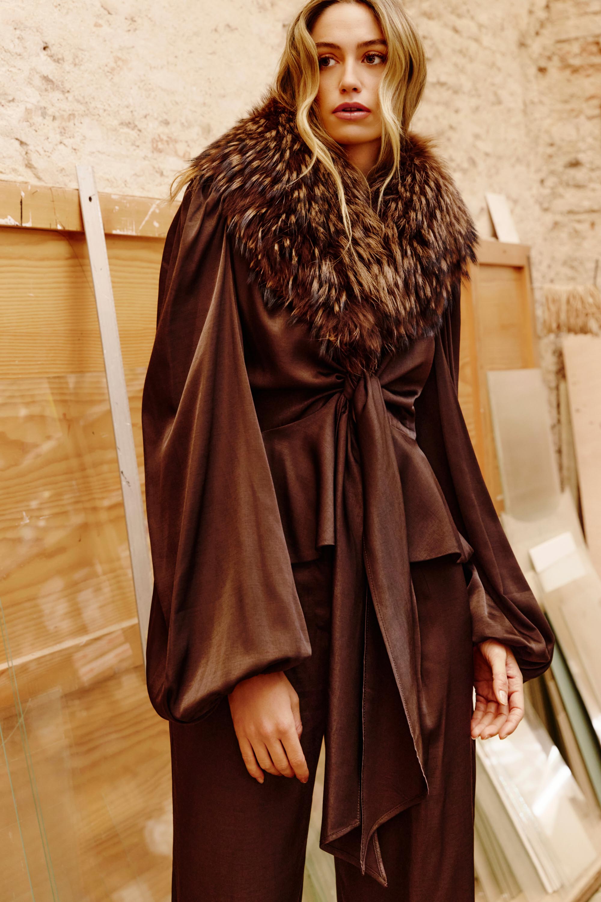 Blusa con escote pronunciado en “V” confeccionada en tejido tipo seda. Cintura marcada con una lazada y peplum estilizando la silueta. Mangas abullonadas ajustadas en puño con elástico.