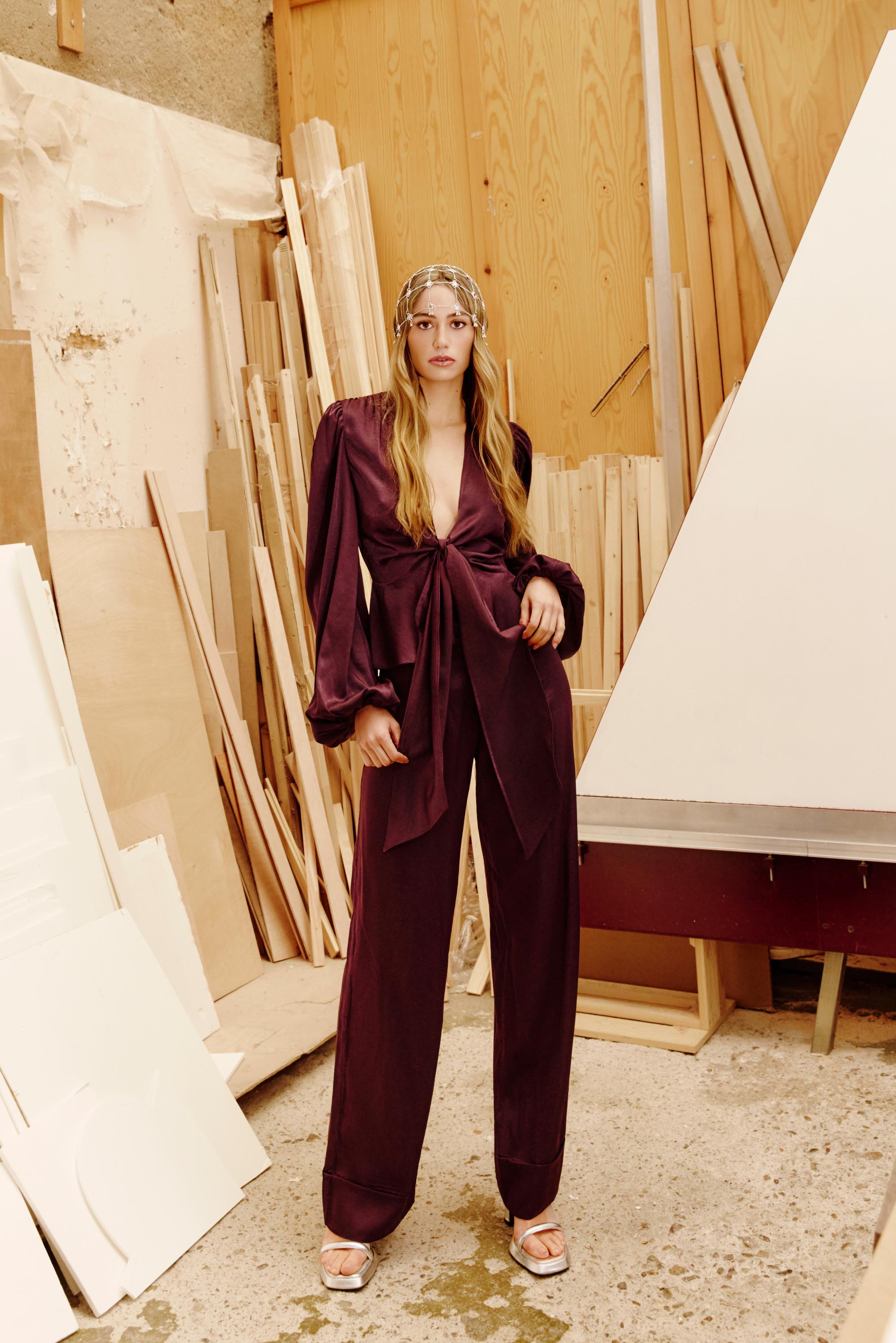 Blusa con escote pronunciado en “V” confeccionada en tejido tipo seda. Cintura marcada con una lazada y peplum estilizando la silueta. Mangas abullonadas ajustadas en puño con elástico.