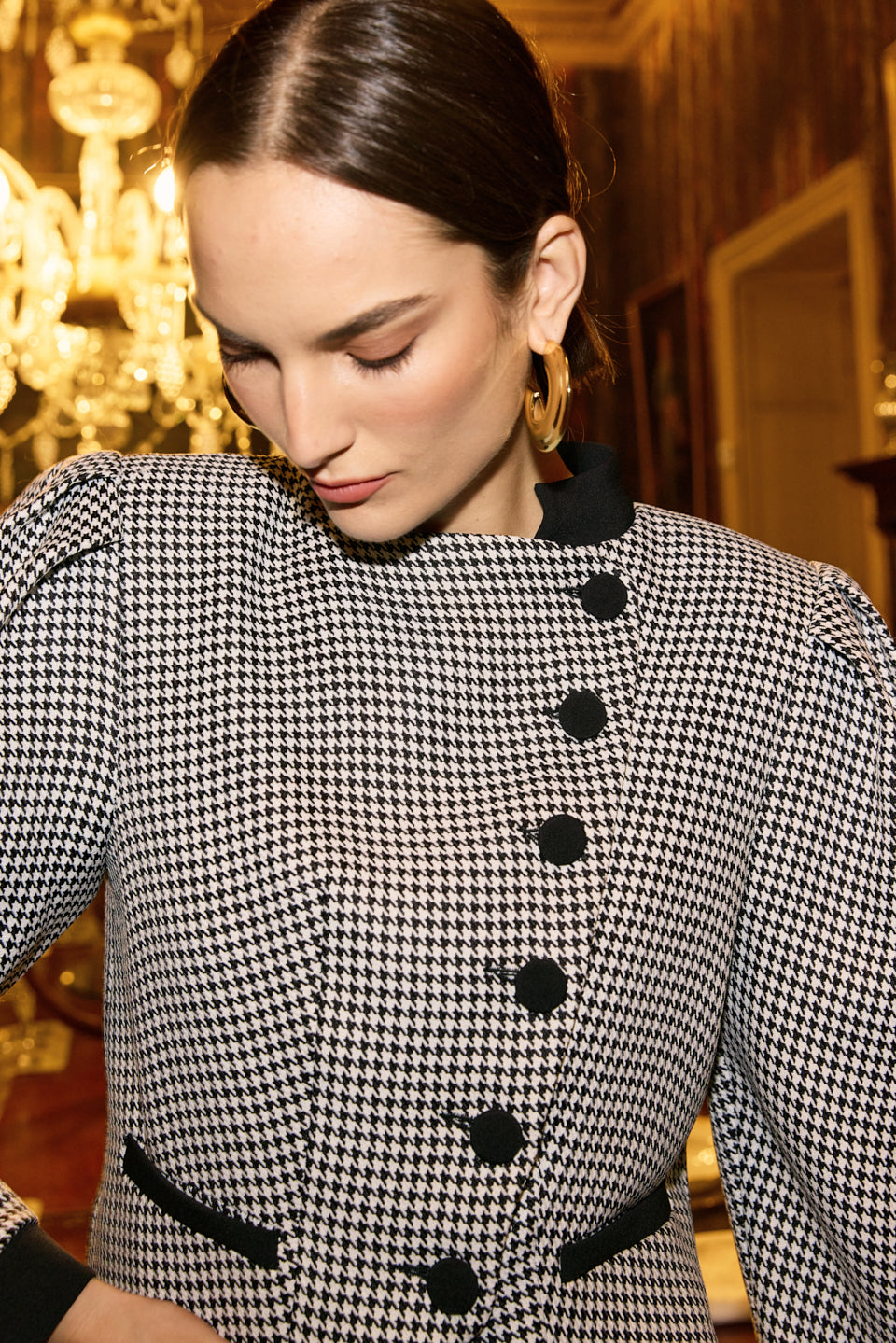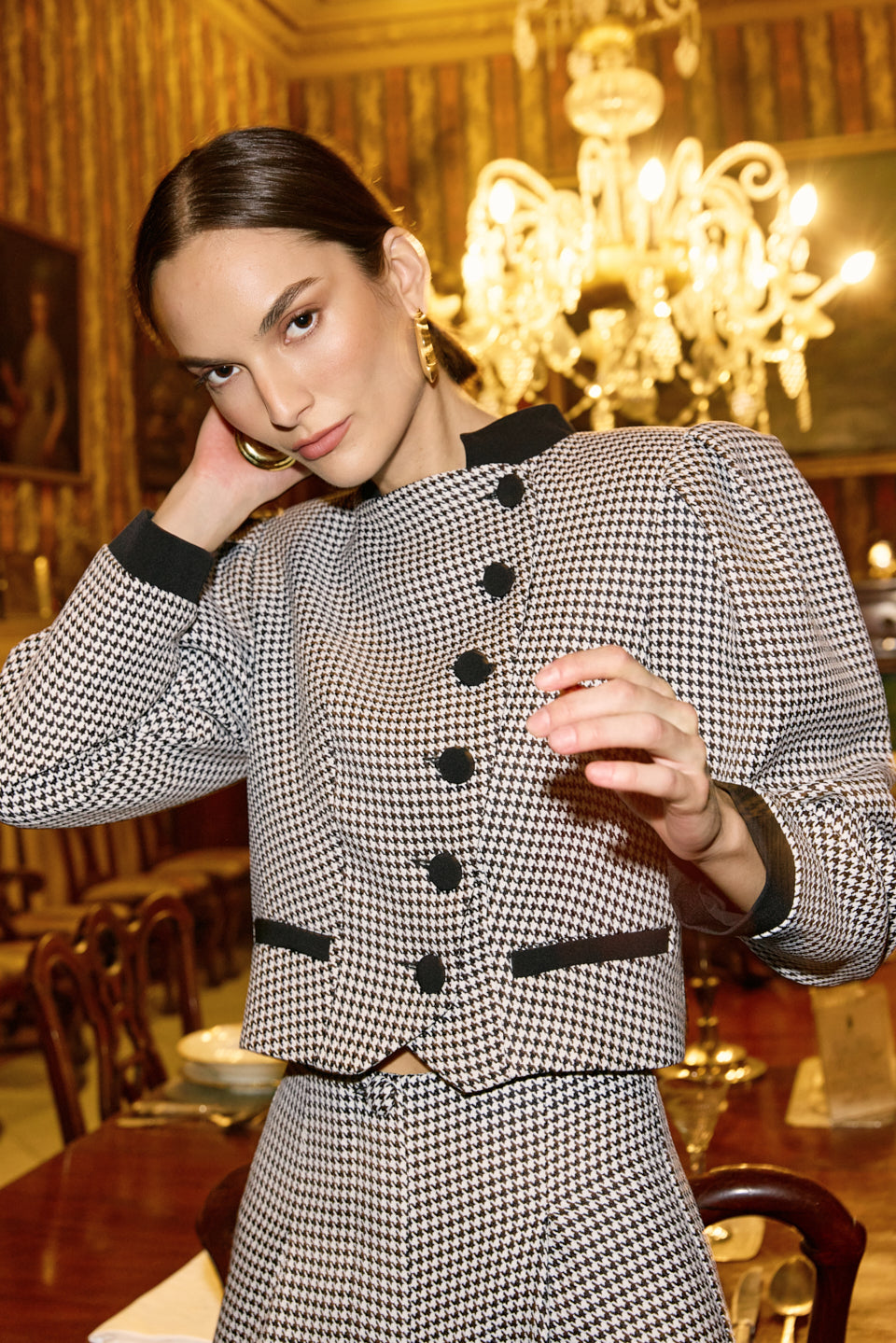 Chaqueta corta asimétrica con manga jamón abullonada y puño en contraste. Confeccionada en jacquard de pata de gallo semi-elástico. Cierre frontal en diagonal con botones forrados en contraste. Cuello mao y bolsillo de vivo en contraste. Manga larga con hombrera. Forro interior. Aconsejamos evitar el uso de accesorios con pedrería, lentejuela o elementos similares que puedan engancharse y dañar el tejido. *La modelo mide 1,78m y viste la talla XS. COMPOSICIÓN TELAS: 100% POLIESTER CUIDADO DEL TEJIDO: Lavado en tintorería. Fabricado en España.