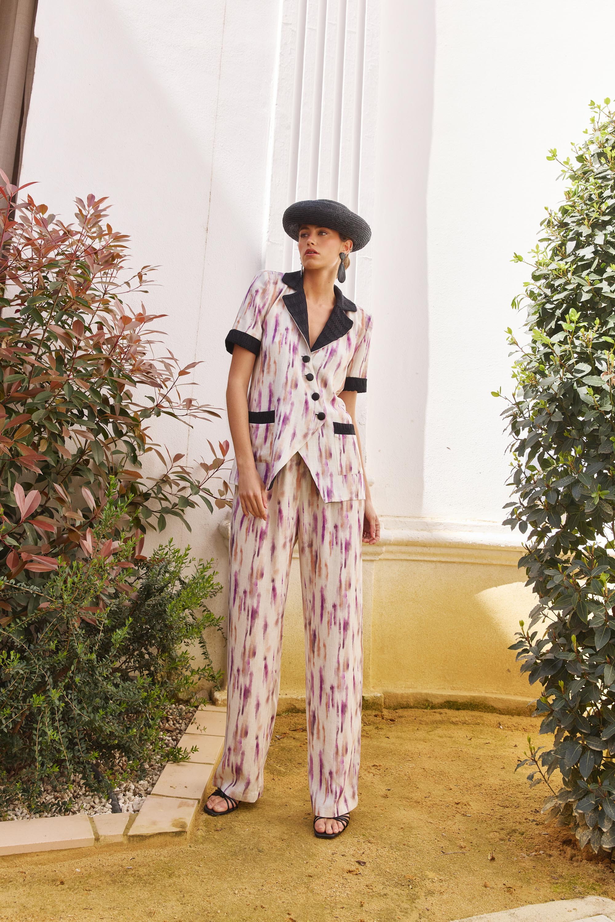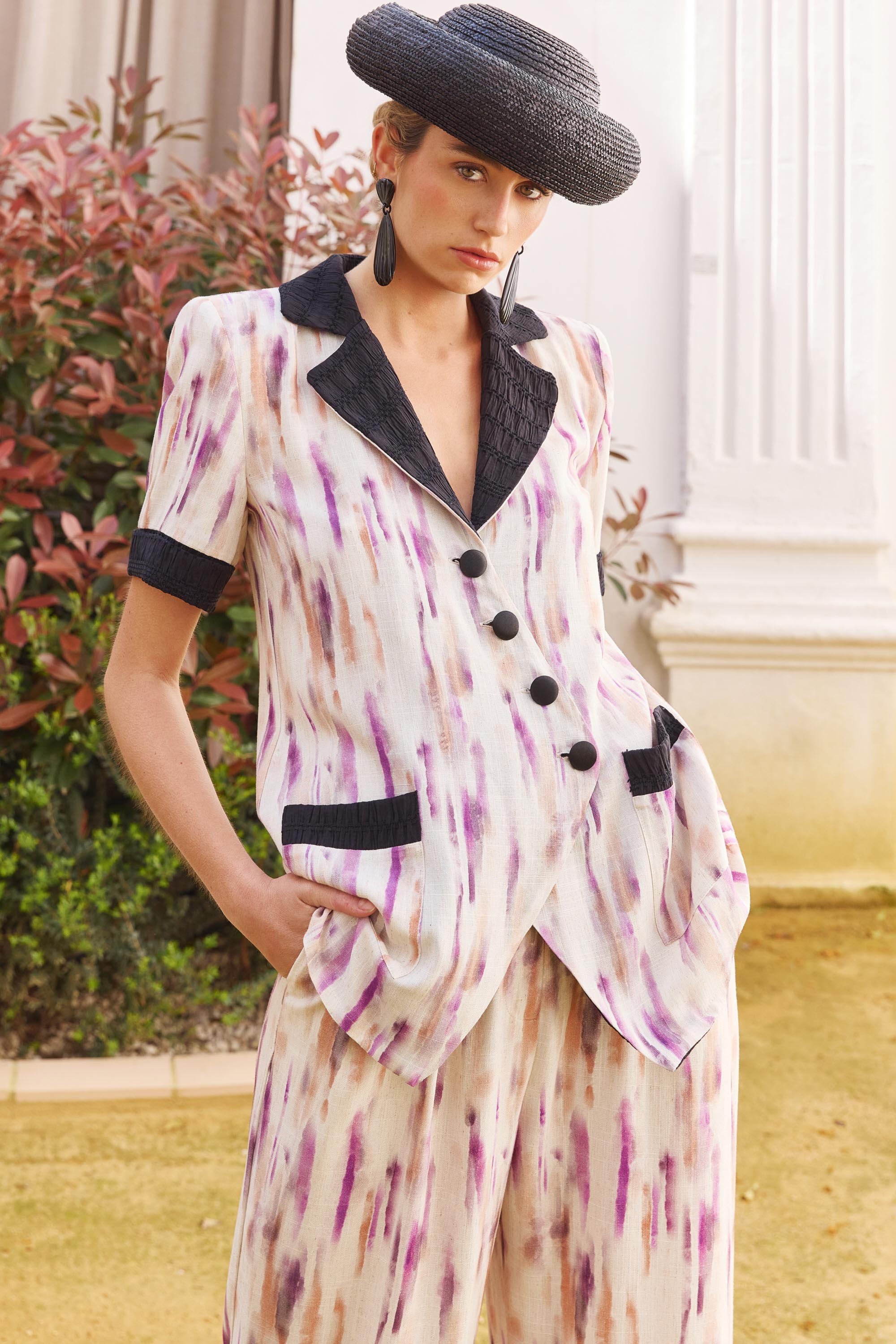 Chaqueta de manga corta con cuello solapa confeccionada en un estampado de viscosa y lino.