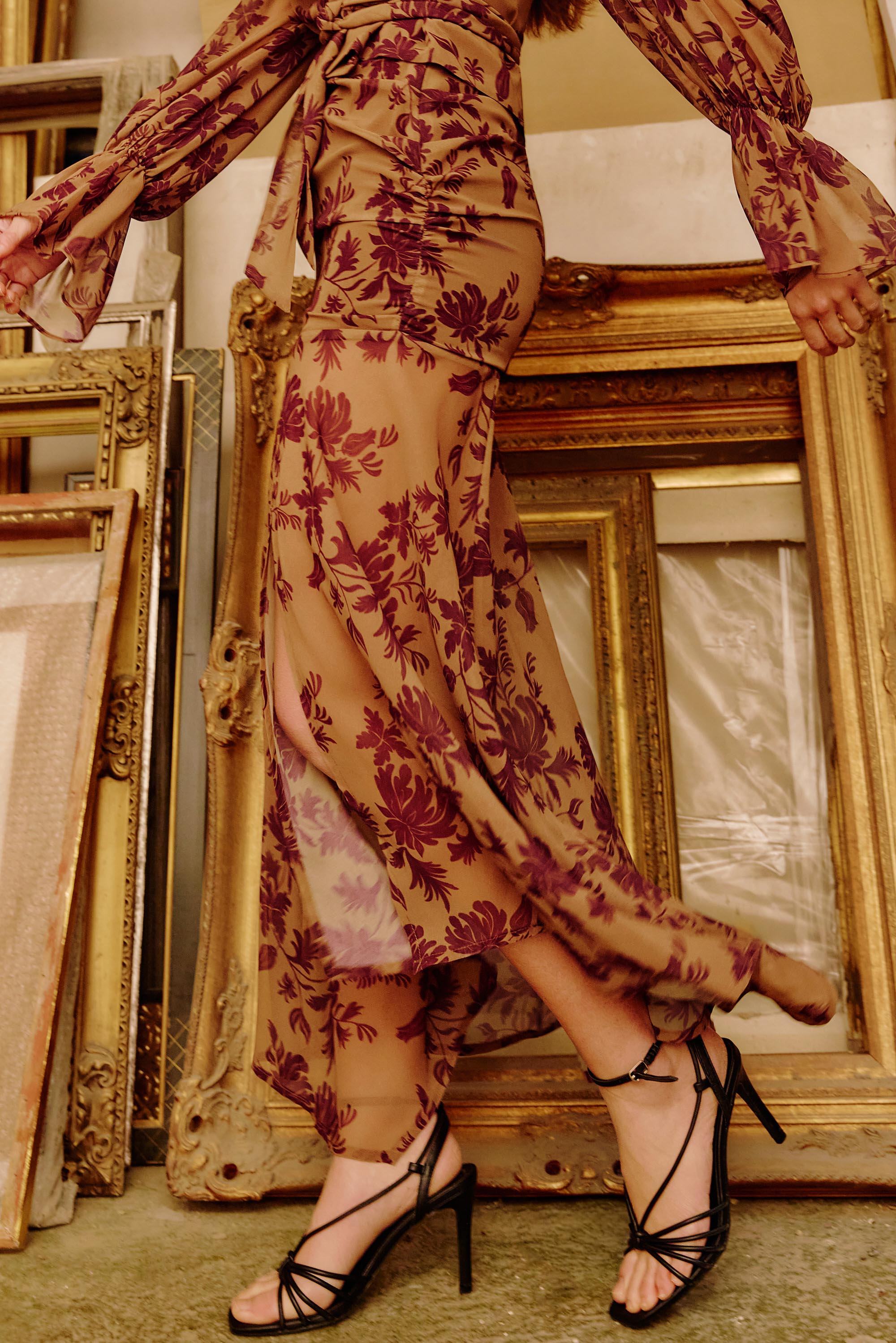 Falda larga fluida semitrasparente. Confeccionada en gasa georgette con estampado de flores. Corte debajo de la cadera con frunce lateral que estiliza la figura. La parte inferior tiene volante asimétrico con abertura delantera. Forro en la parte superior de la falda al tono. Cremallera invisible lateral.