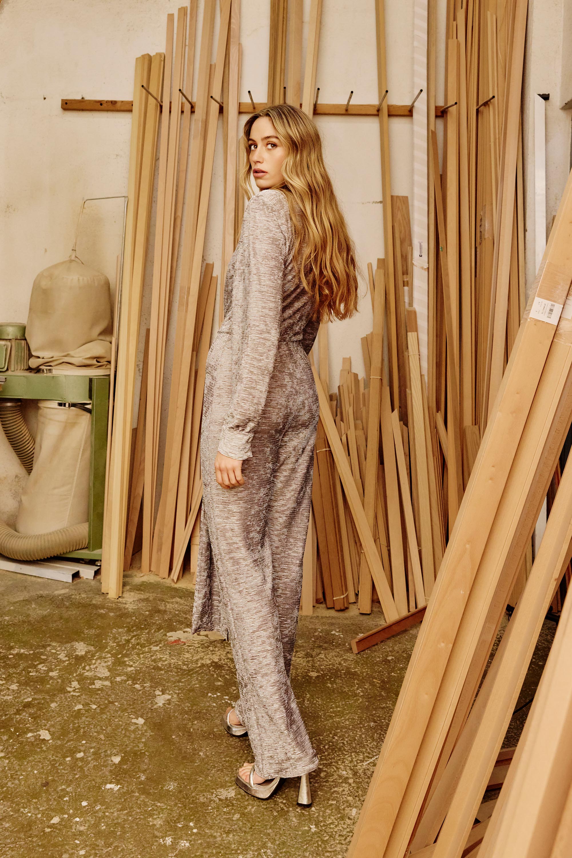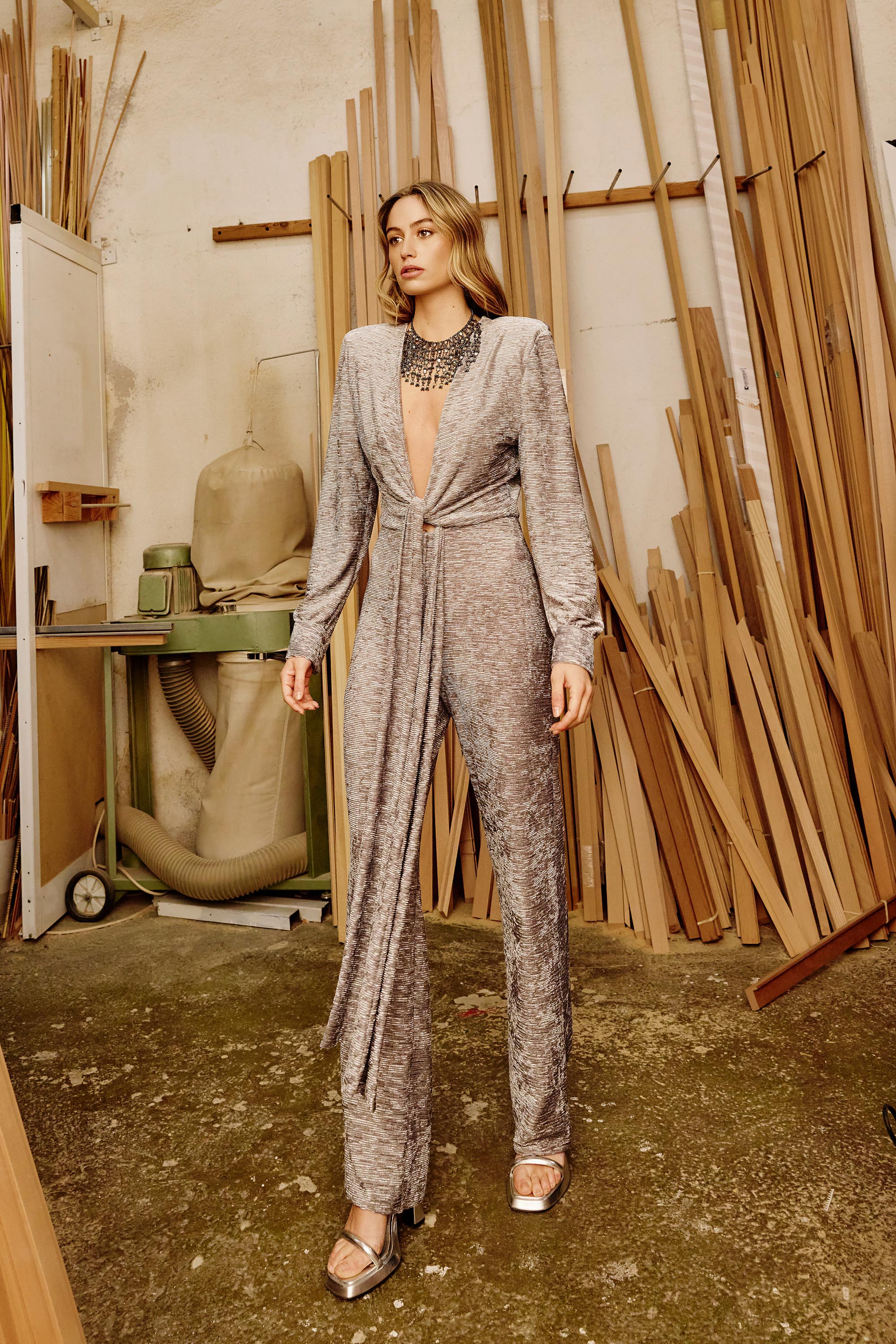 Mono largo acampanado confeccionado en terciopelo rallado con brillo