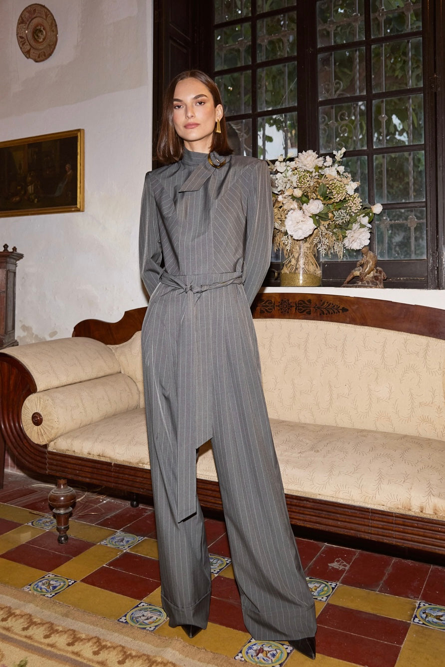 Mono largo confeccionado en tejido de rayas. Cuello con cierre con hebilla nacarada.