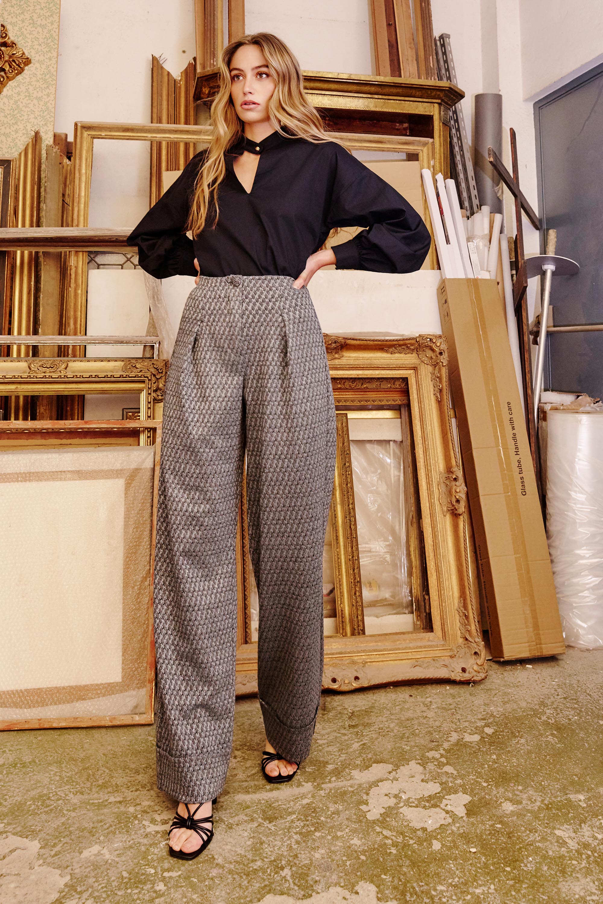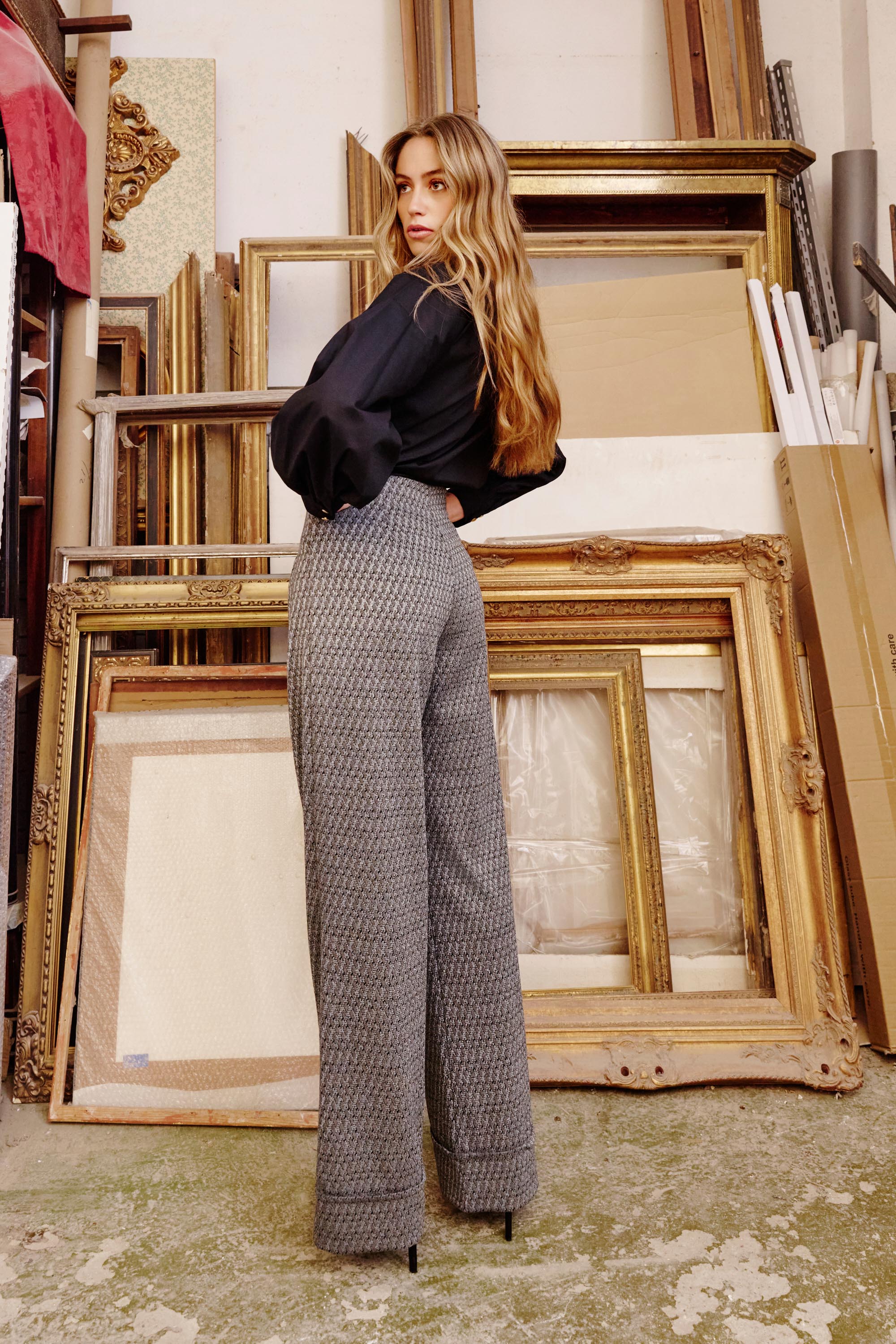 Pantalón tailoring de talle alto y pata ancha, confeccionado en tejido jacquard