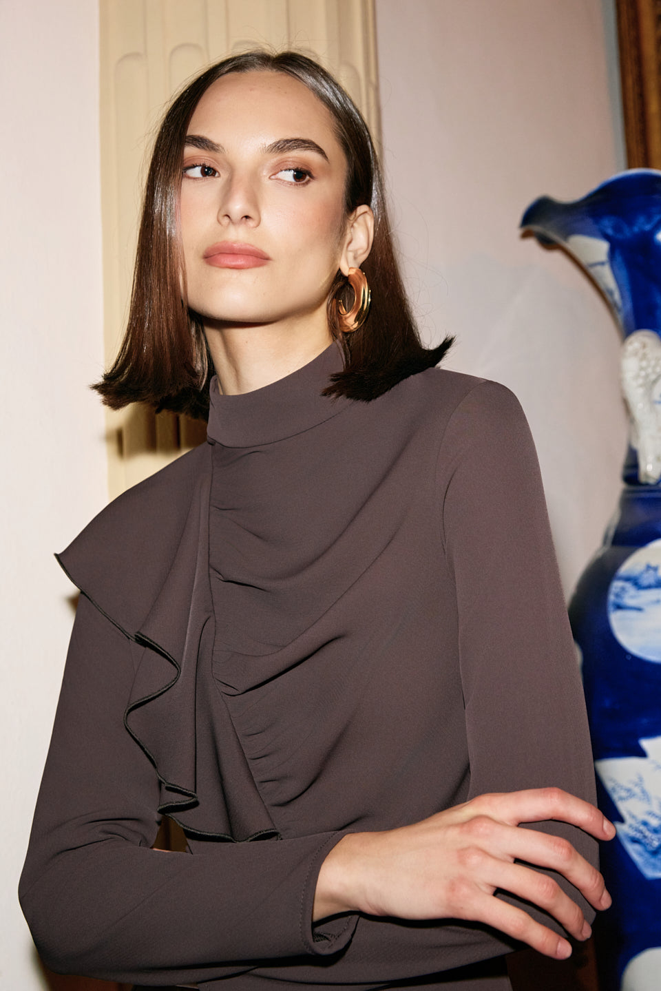 Top asimétrico confeccionado en crêpe semi-elástico. Manga larga ajustada. Escote delantero cerrado con cuello alto y frunce diagonal en el pecho de donde sale un volante de capa.