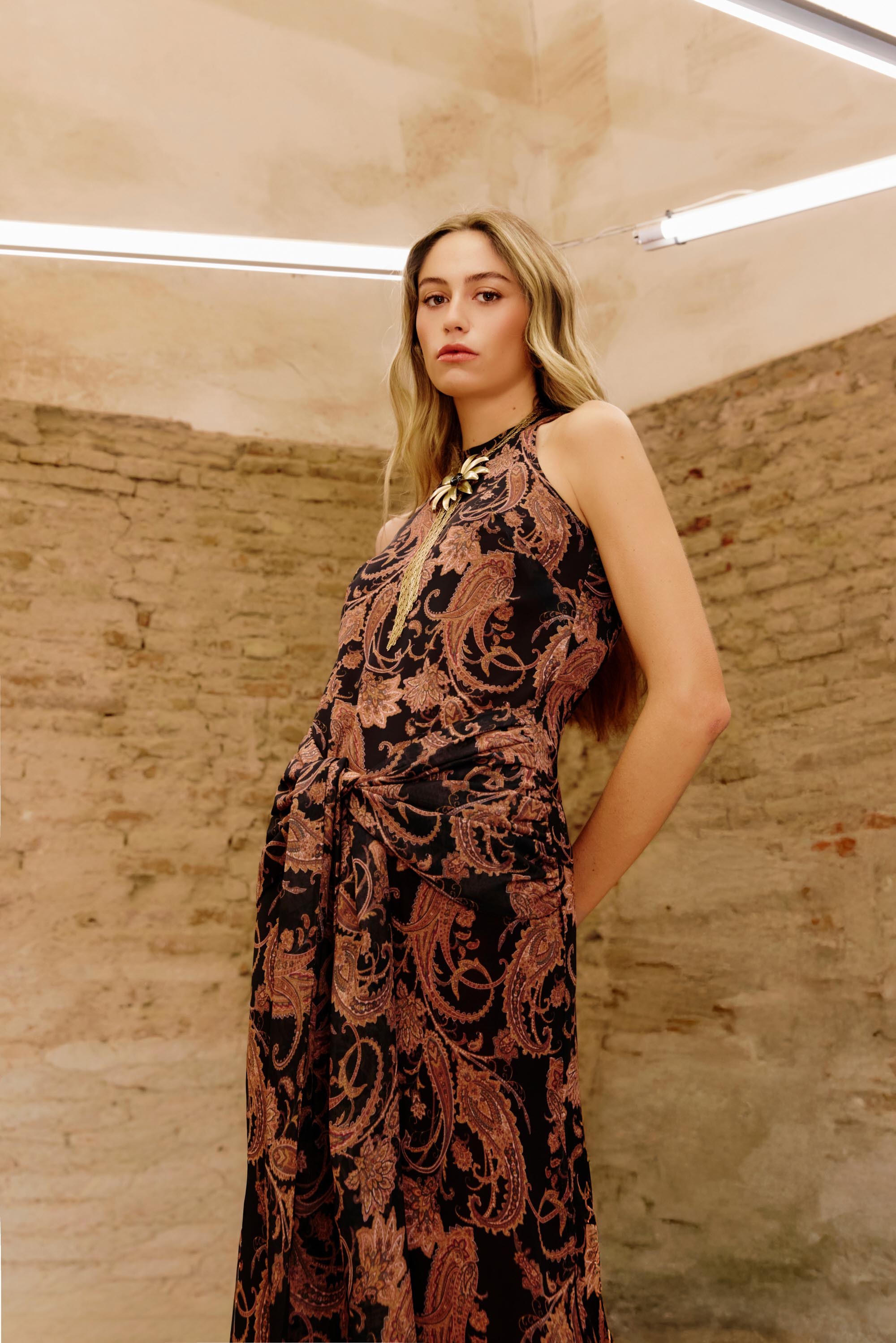 cashmere. Escote tipo halter. Lazada fruncida en cadera, la cual puede ser anudada tanto en la parte delantera como trasera. Aberturas en los dos laterales del vestido que permite más movilidad y movimiento del tejido en la parte inferior. Forro en tono más claro para realzar el estampado principal. Cierre con cremallera invisible en centro espalda.